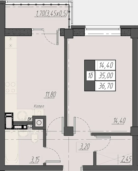 Площадь от 36.7 м2